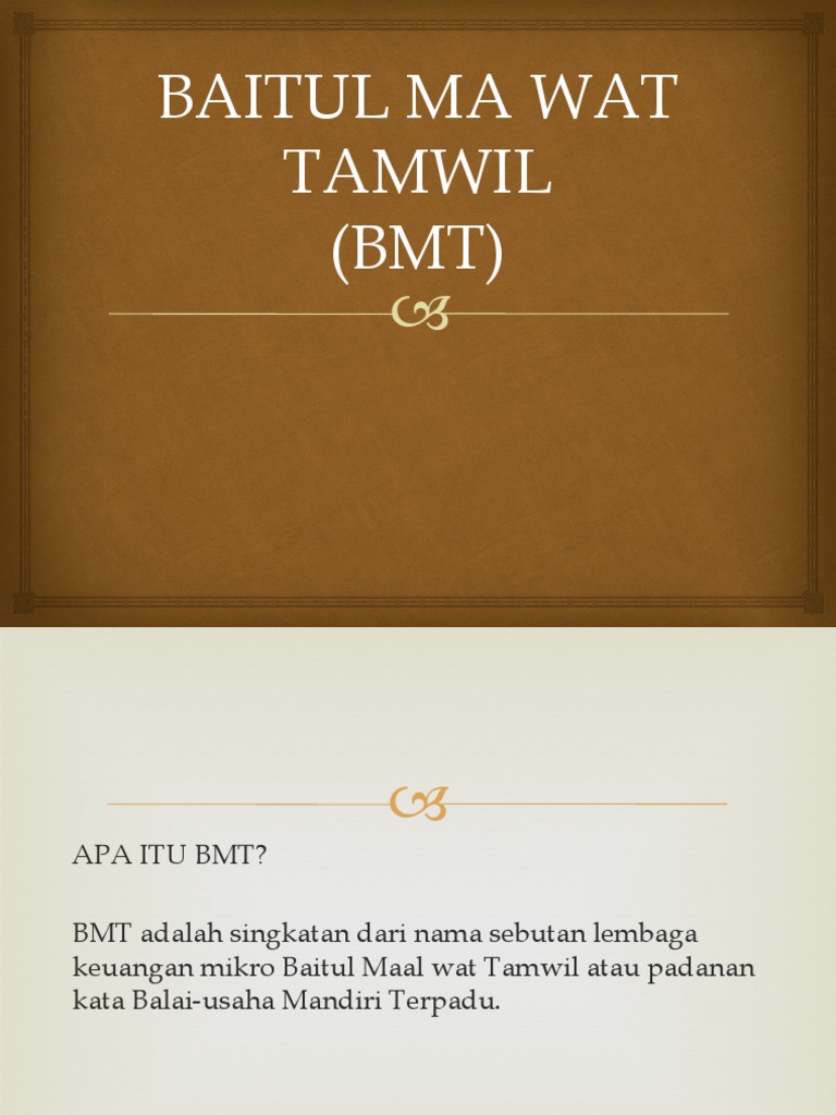 Bmt adalah singkatan dari nama sebutan lembaga keuangan mikro baitul maal wat tamwil atau padanan kata balai usaha mandiri terpadu.
